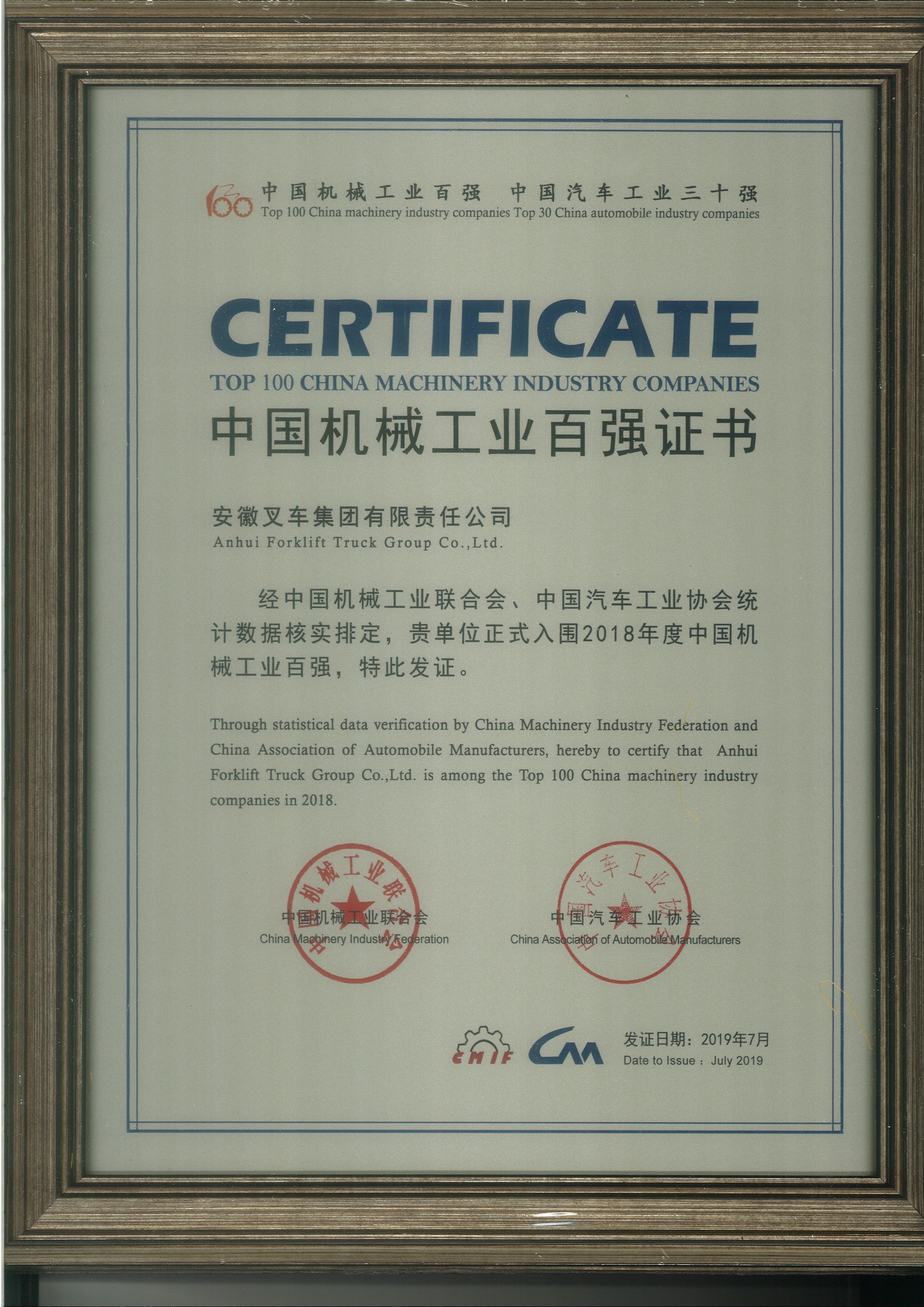 2018 安徽叉車集團有限責任公司2018年中國機械500強